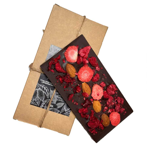 Склад: какао терте, какао масло , кокосовий цукор, сублімована малина, полуниця, пекан